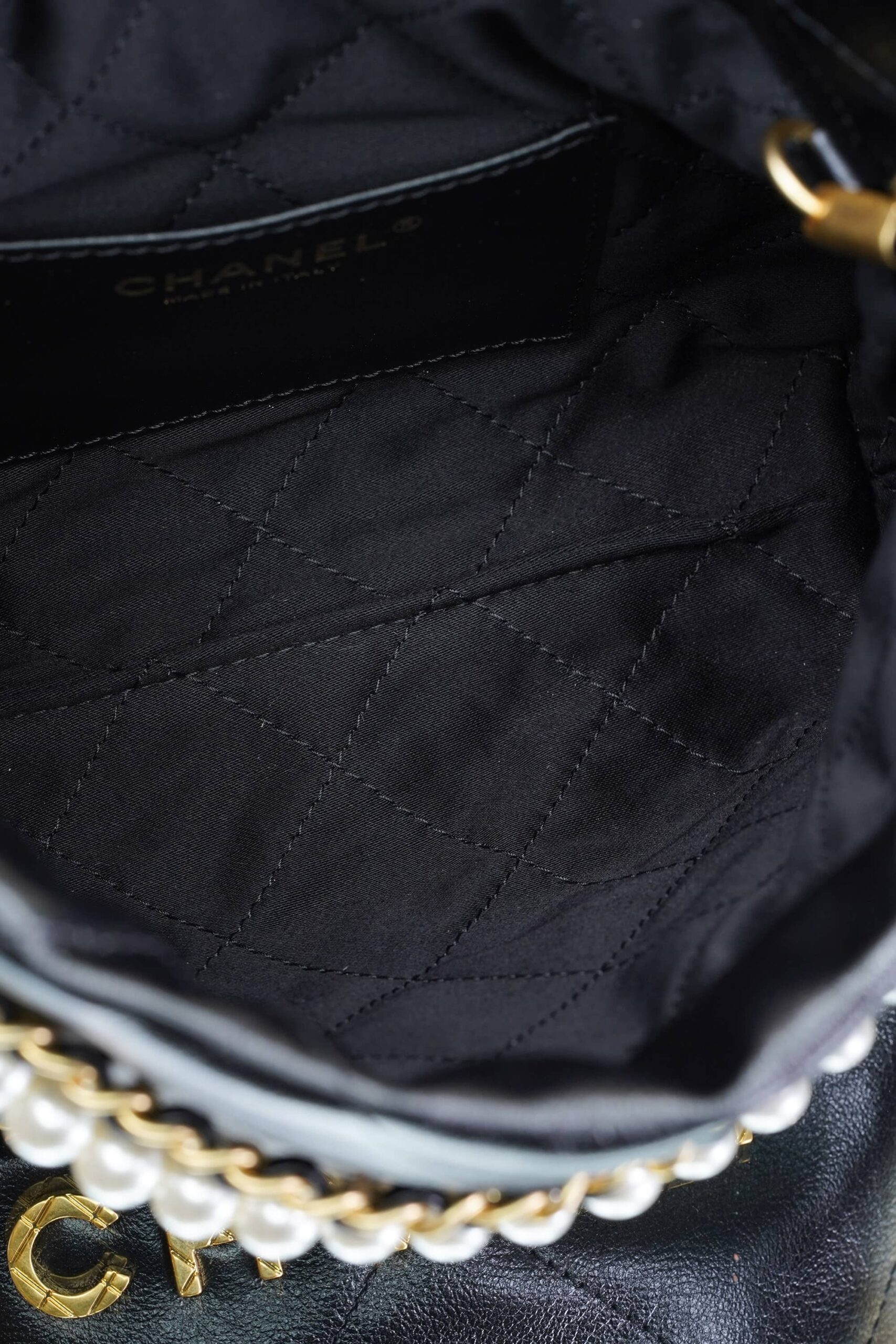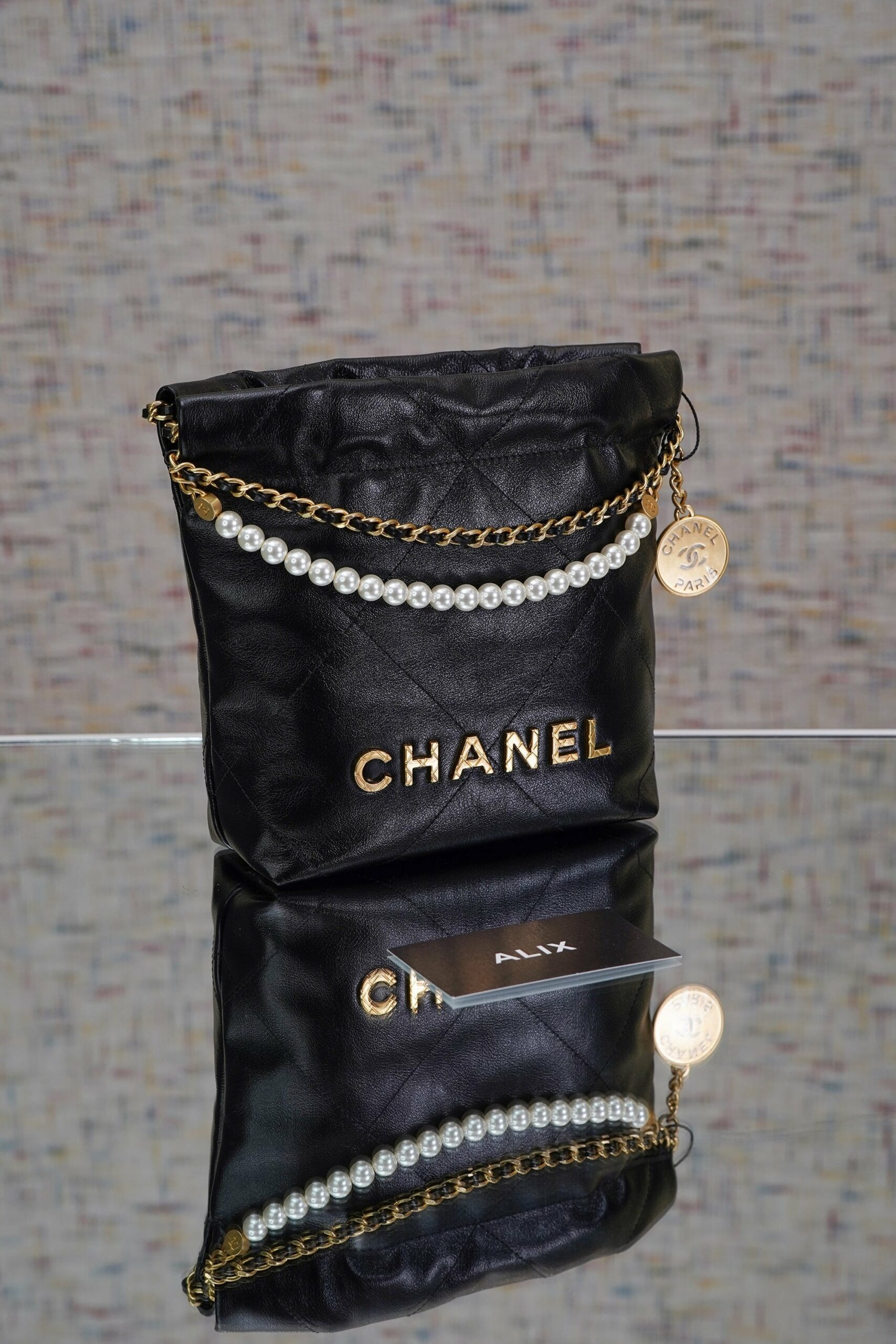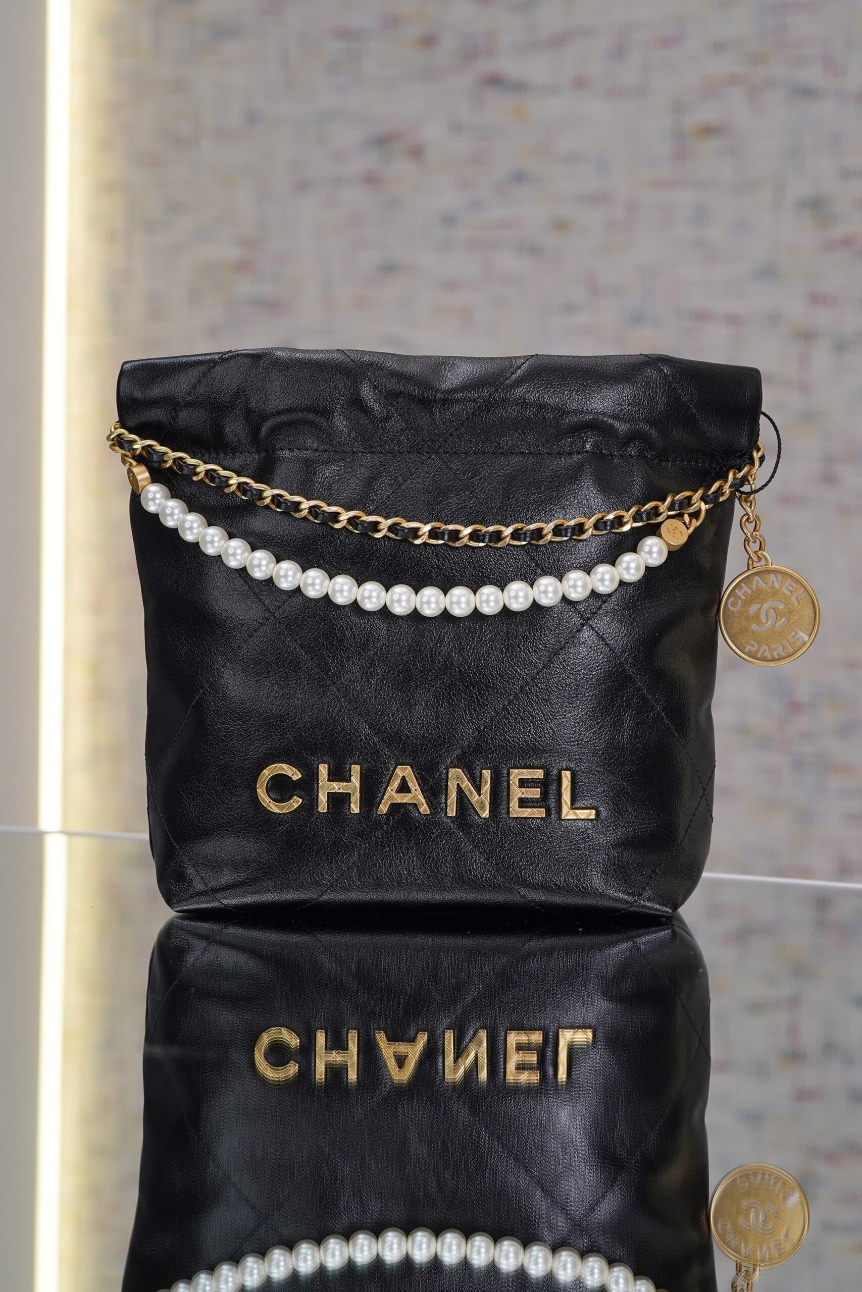 CHANEL 22 PEARL CHAIN – MINI – BLACK – SHINY CALFSKIN – GOLD