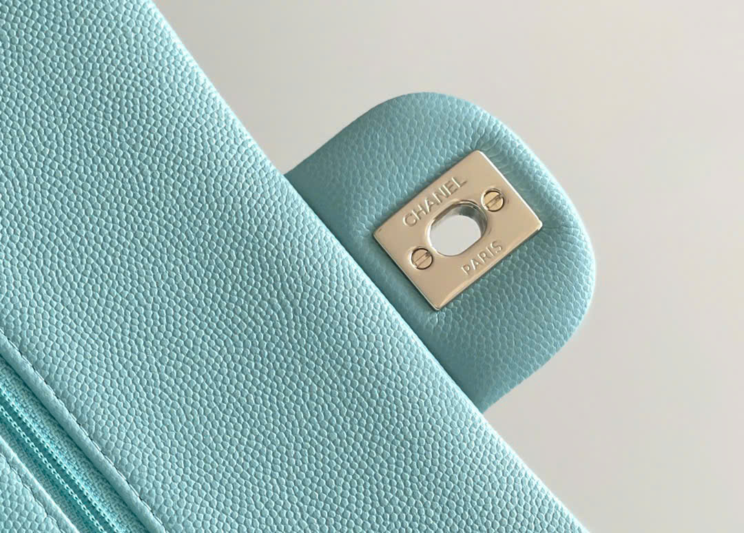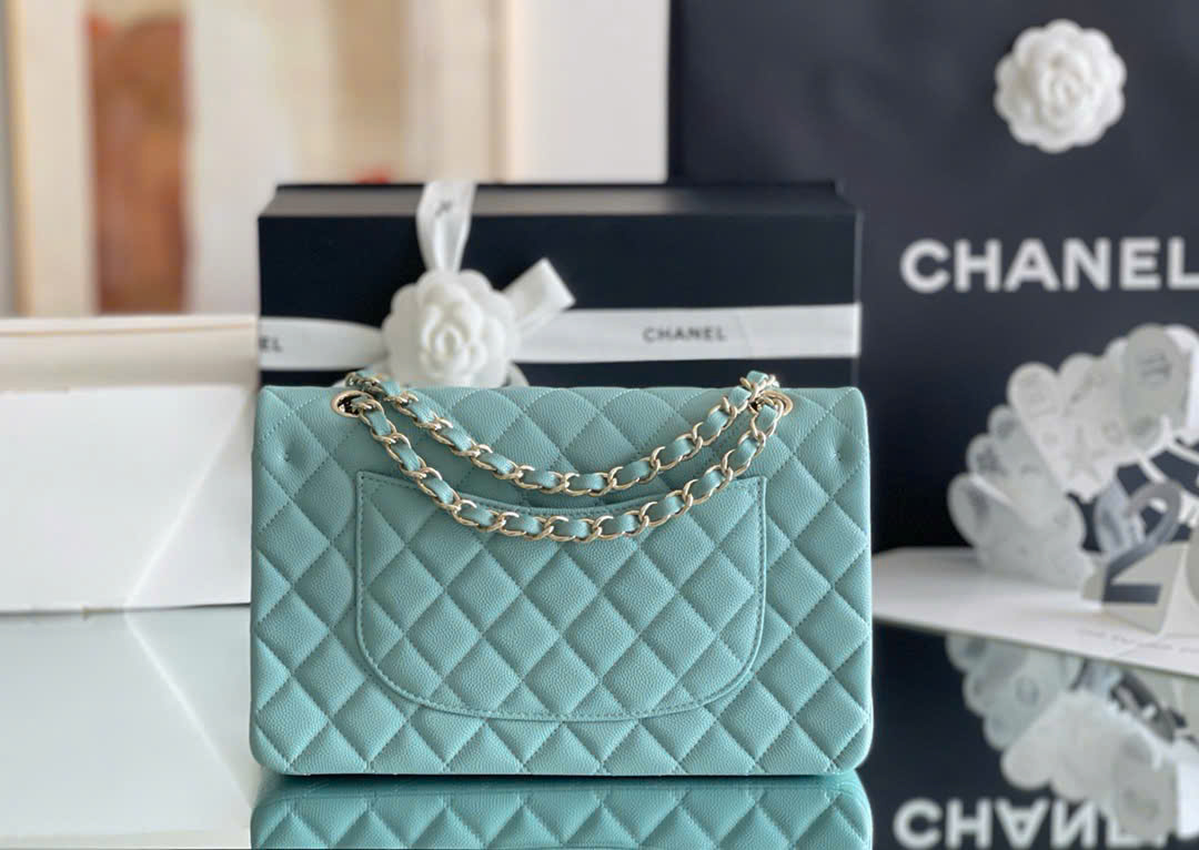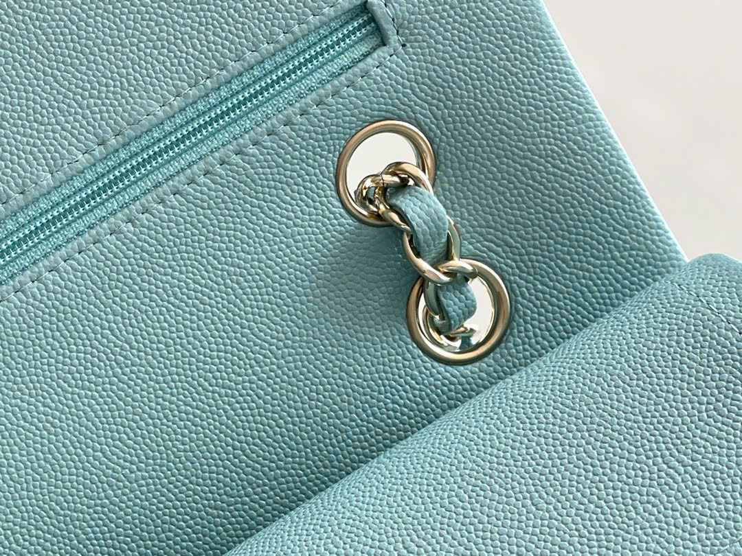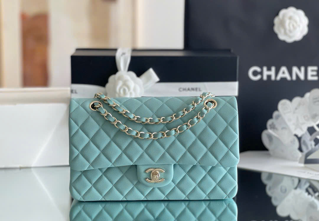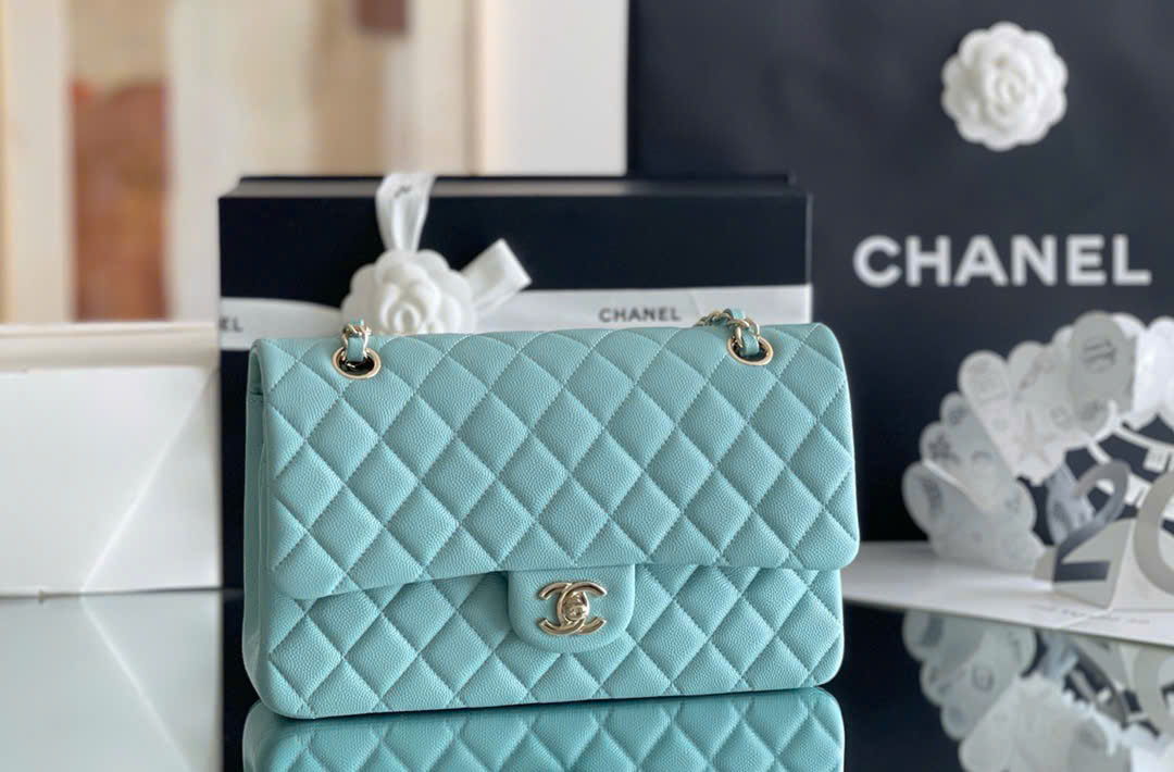 CHANEL CLASSIC – 25 – LIGHT BLUE – CAVIAR – GOLD CHAMPAGNE