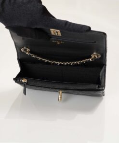 This iconic Chanel Wallet on Chain is beautifully upgraded with a chic mini top handle, premium caviar leather, a perfectly structured silhouette, the legendary CC lock, and a luxurious gold-plated chain.