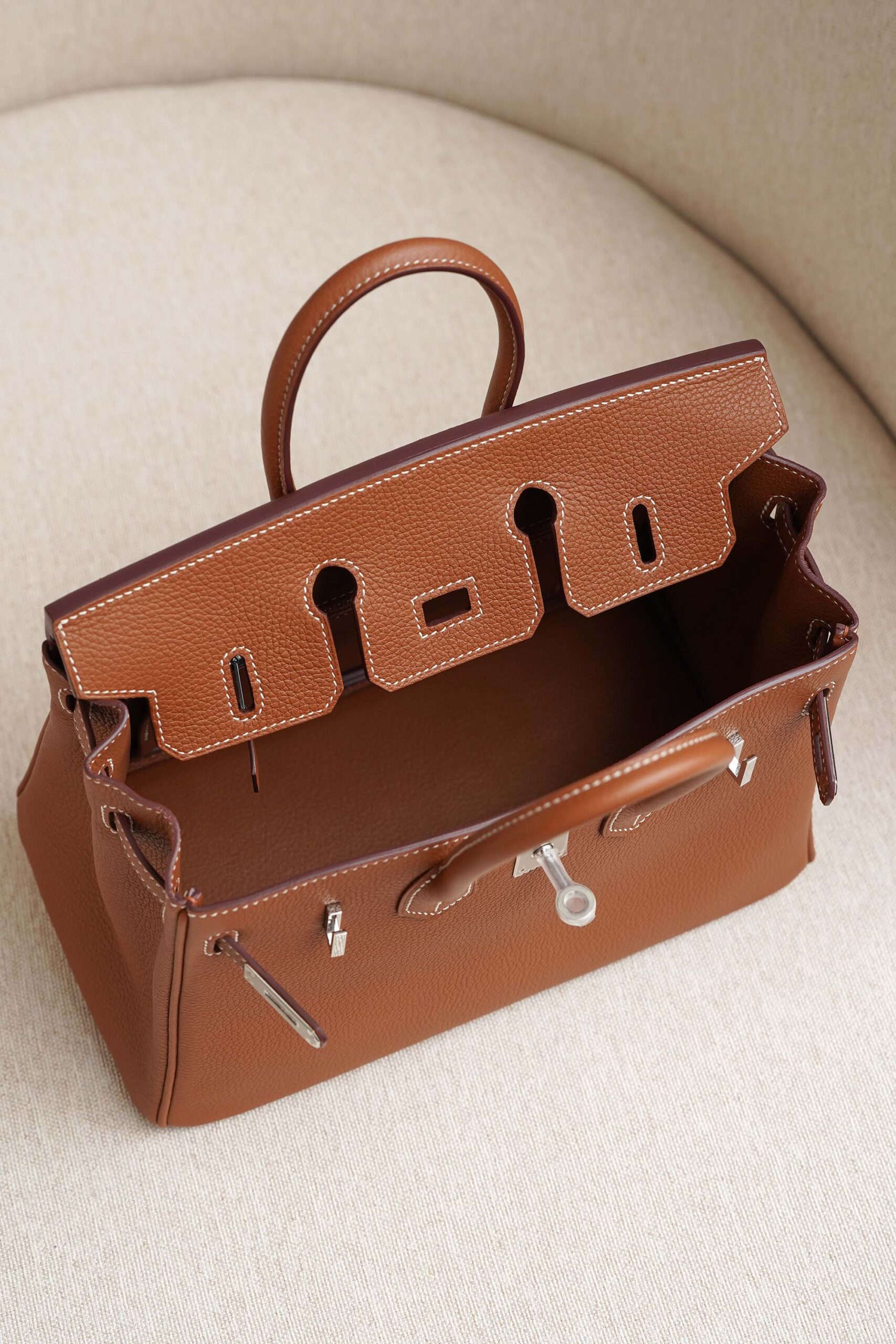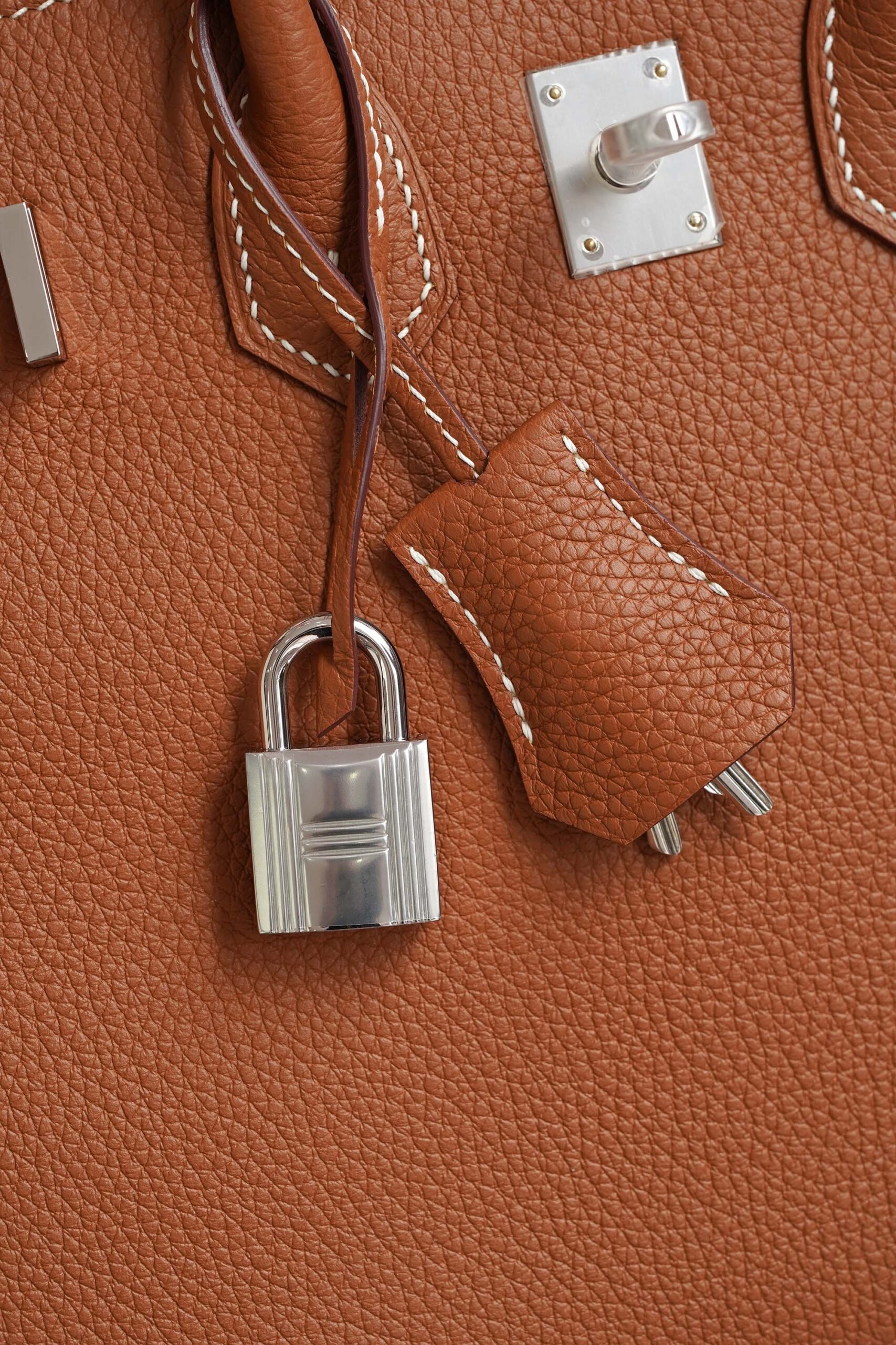 The signature Hermès bag lock: Opens up a spacious space, containing all the necessary items but still maintains a neat, elegant appearance.